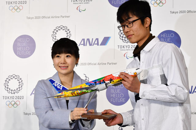 羽田空港の格納庫でHELLO 2020 JETをデザインした松本朝陽さん(右)にサイン入り模型を手渡す福原愛選手=18年1月28日 PHOTO: Tadayuki YOSHIKAWA/Aviation Wire